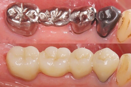 金属の詰め物や被せ物では、長期間使用するうちに金属イオンが溶け出し、歯ぐきが黒ずんだり、アレルギー症状を引き起こしたりする場合があります。